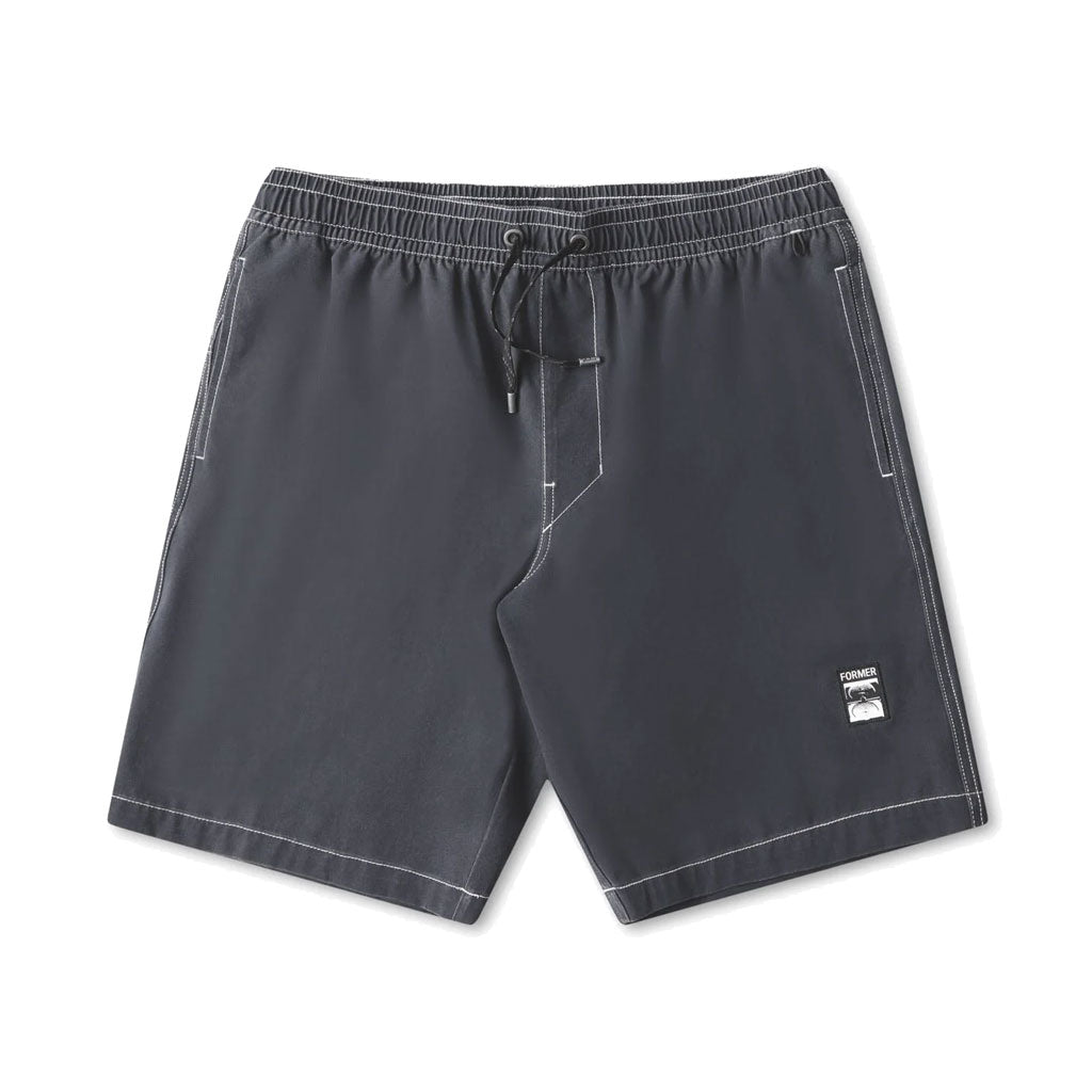 Constructed from a sustainable recycled polyester-spandex blend (90% recycled polyester 10% spandex) 4-way stretch fabric with a pigment print and vintage wash finish. Delivered in our FORMER Swans 18" swim trunk fit featuring all-over yardage printed design, signature velcro back patch pocket with FORMER webbing and eyelet, contrast stitch detail, drawcord closure with FORMER branded metal aglets, elastic key loop, and elastic waist