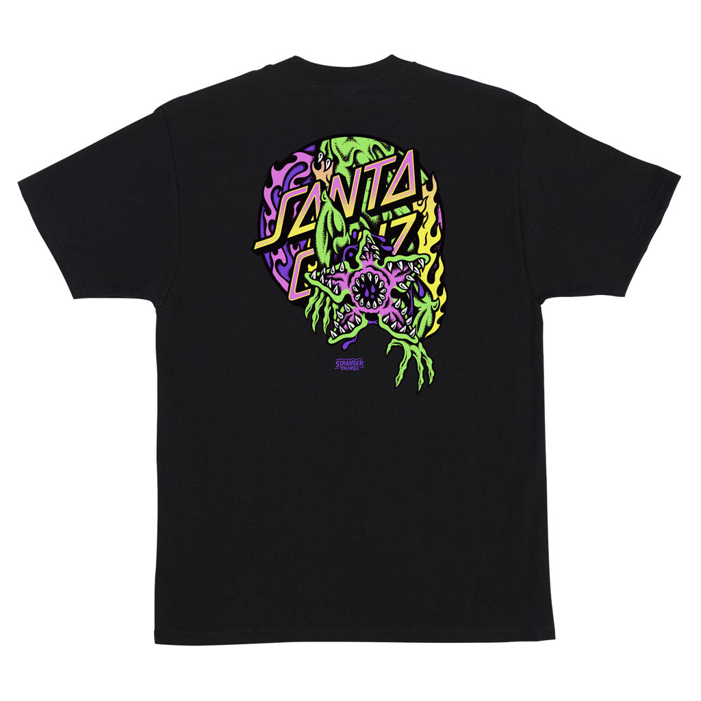The Santa Cruz Stranger Things Demogorgon Dot men's short sleeve regular fit t-shirt features small front and large back Santa Cruz x Stranger Things Demogorgon Dot artwork printed in soft hand ink.
