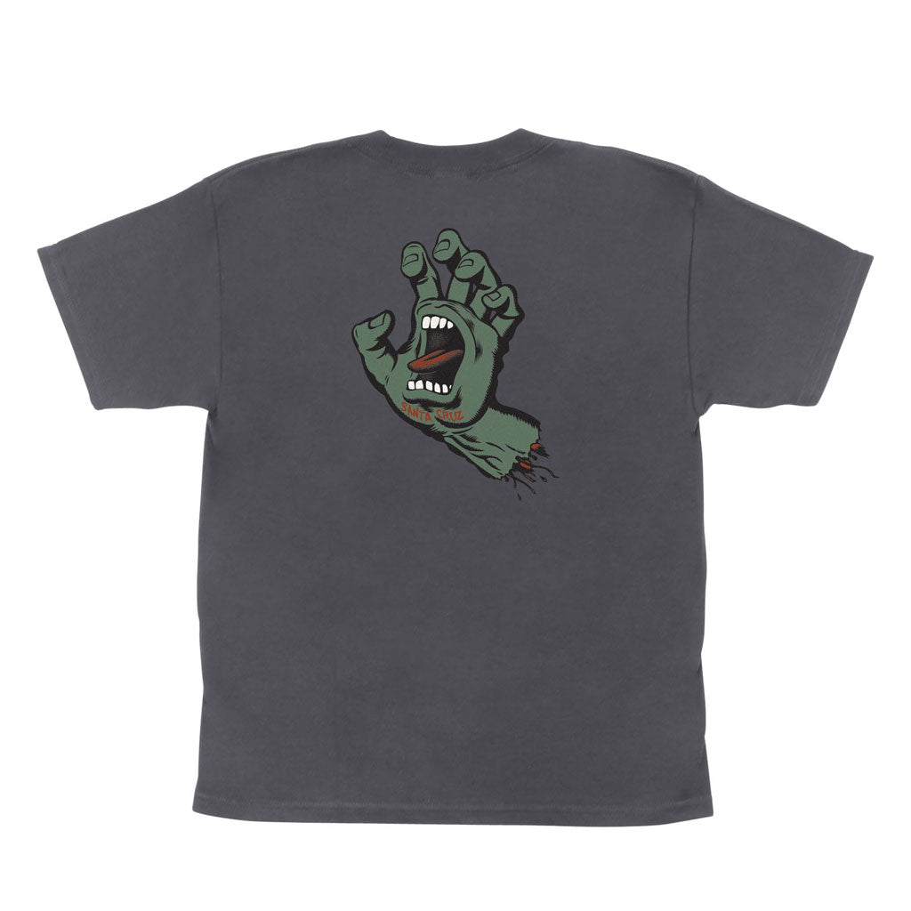The Santa Cruz Screaming Hand youth regular fit short-short sleeve cotton t-shirt features small front and large back Santa Cruz Screaming Hand prints.