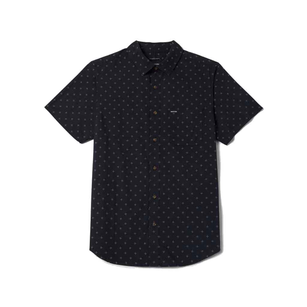 Classic button-up with custom Brixton prints and stretch comfort, perfect for vacation.