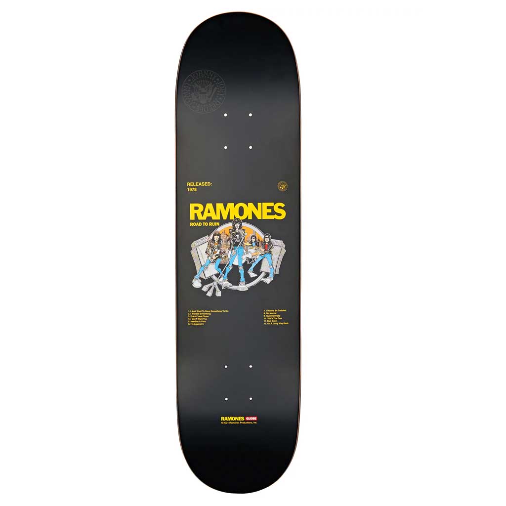 The G2 Ramones Deck 8.25" in Road to Russia is a full concave deck constructed from Resin-7 hard rock maple and features album cover artwork from 'Rocket to Russia', the band's fourth studio album released in 1978. Featuring full concave achieved by individual pressing and constructed using epoxy-resin to make it lighter, stronger, and longer lasting than normal water-based decks.
